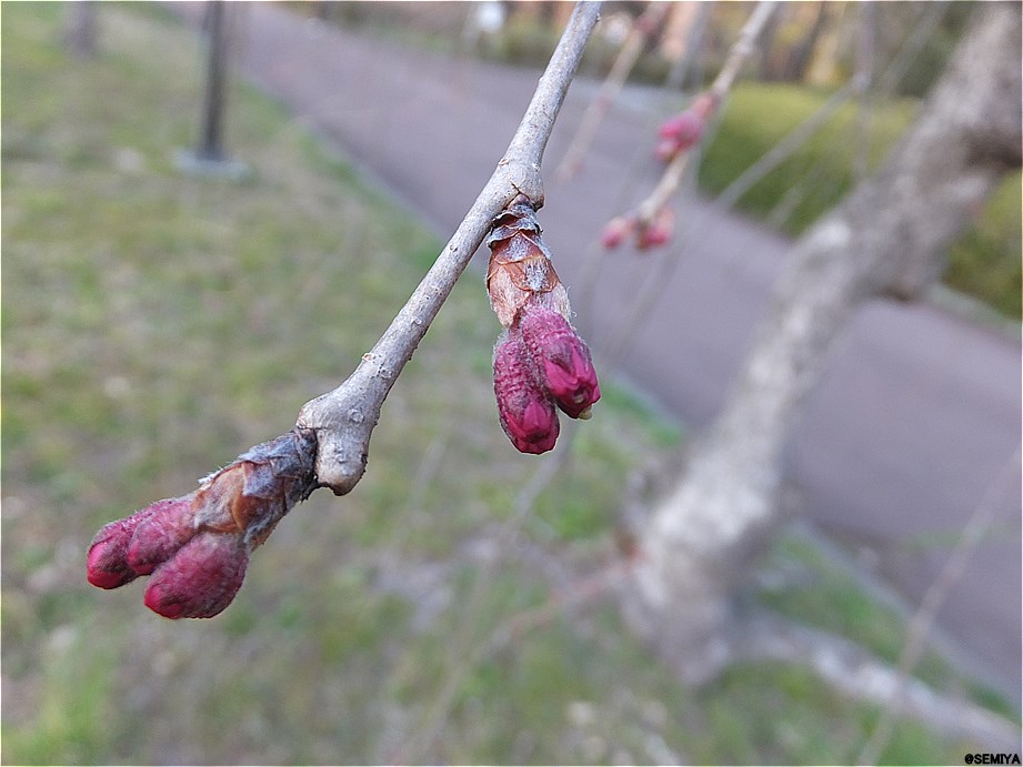 榴岡公園の北西側の枝垂れ桜が多い場所ですが、ご覧の通りまだつぼみも小さく、開花までもう少しかかりそうですね。